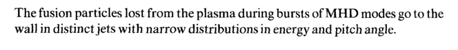 The fusion particles lost from the plasma during bursts of MHD modes go to the wall in distinct jets with narrow distributions in energy and pitch angle.