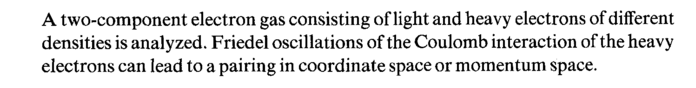 A two-component electron gas consisting of light and heavy electrons of different densities is analyzed. Friedel oscillations of the Coulomb interaction of the heavy electrons can lead to a pairing in coordinate space or momentum space.