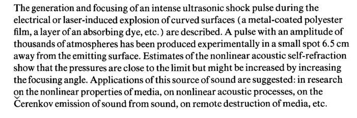 The generation and focusing of an intense ultrasonic shock pulse during the electrical or laser-induced explosion of curved surfaces (a metal-coated polyester film, a layer of an absorbing dye, etc.) are described. A pulse with an amplitude of thousands of atmospheres has been produced experimentally in a small spot 6.5 cm away from the emitting surface. Estimates of the nonlinear acoustic self-refraction show that the pressures are close to the limit but might be increased by increasing the focusing angle. Applications of this source of sound are suggested: in research on the nonlinear properties of media, on nonlinear acoustic processes, on the Cerenkov emission of sound from sound, on remote destruction of media, etc.