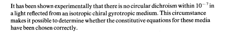 It has been shown experimentally that there is no circular dichroism within 10 ~7 in a light reflected from an isotropic chiral gyrotropic medium. This circumstance makes it possible to determine whether the constitutive equations for these media have been chosen correctly.
