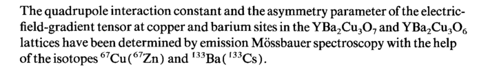 The quadrupole interaction constant and the asymmetry parameter of the electric-field-gradient tensor at copper and barium sites in the YBa2Cu307 and YBa2Cu306 lattices have been determined by emission Mossbauer spectroscopy with the help of the isotopes 67Cu(67Zn) and i33Ba( I33Cs).
