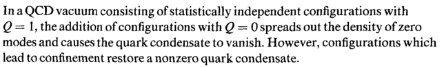 In a QCD vacuum consisting of statistically independent configurations with Q= I, the addition of configurations with Q = 0 spreads out the density of zero modes and causes the quark condensate to vanish. However, configurations which lead to confinement restore a nonzero quark condensate.