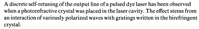 A discrete self-retuning of the output line of a pulsed dye laser has been observed when a photorefractive crystal was placed in the laser cavity. The effect stems from an interaction of variously polarized waves with gratings written in the birefringent crystal.