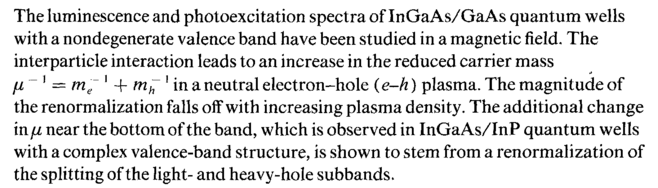 The luminescence and photoexcitation spectra of InGaAs/GaAs quantum wells with a nondegenerate valence band have been studied in a magnetic field. The interparticle interaction leads to an increase in the reduced carrier mass μ 1 = m~1 + τηζ 1 in a neutral electron-hole (e-h) plasma. The magnitude of the renormalization falls off with increasing plasma density. The additional change in μ near the bottom of the band, which is observed in InGaAs/InP quantum wells with a complex valence-band structure, is shown to stem from a renormalization of the splitting of the lightand heavy-hole subbands.