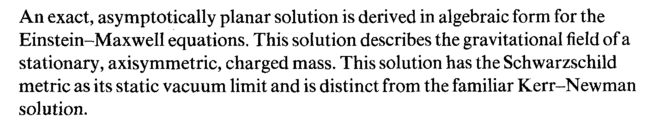 An exact, asymptotically planar solution is derived in algebraic form for the Einstein-Maxwell equations. This solution describes the gravitational field of a stationary, axisymmetric, charged mass. This solution has the Schwarzschild metric as its static vacuum limit and is distinct from the familiar Kerr-Newman solution.