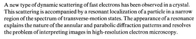 A new type of dynamic scattering of fast electrons has been observed in a crystal. This scattering is accompanied by a resonant localization of a particle in a narrow region of the spectrum of transverse-motion states. The appearance of a resonance explains the nature of the annular and parabolic diffraction patterns and resolves the problem of interpreting images in high-resolution electron microscopy.