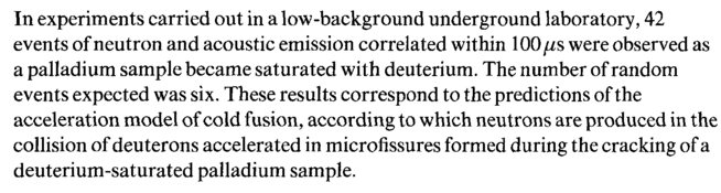 In experiments carried out in a low-background underground laboratory, 42 events of neutron and acoustic emission correlated within 100 //s were observed as a palladium sample became saturated with deuterium. The number of random events expected was six. These results correspond to the predictions of the acceleration model of cold fusion, according to which neutrons are produced in the collision of deuterons accelerated in microfissures formed during the cracking of a deuterium-saturated palladium sample.