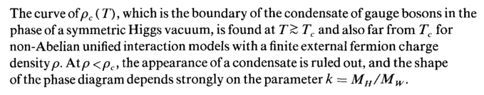 The curve of pc(T), which is the boundary of the condensate of gauge bosons in the phase of a symmetric Higgs vacuum, is found at Tc and also far from Tc for non-Abelian unified interaction models with a finite external fermion charge density p. At ρ <pc , the appearance of a condensate is ruled out, and the shape of the phase diagram depends strongly on the parameter к ~ MH/MW.