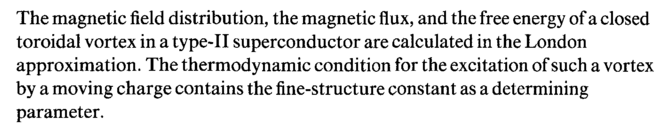 The magnetic field distribution, the magnetic flux, and the free energy of a closed toroidal vortex in a type-II superconductor are calculated in the London approximation. The thermodynamic condition for the excitation of such a vortex by a moving charge contains the fine-structure constant as a determining parameter.