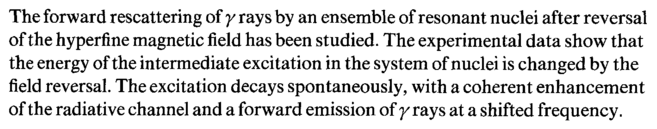 The forward rescattering of γ rays by an ensemble of resonant nuclei after reversal of the hyperfine magnetic field has been studied. The experimental data show that the energy of the intermediate excitation in the system of nuclei is changed by the field reversal. The excitation decays spontaneously, with a coherent enhancement of the radiative channel and a forward emission of γ rays at a shifted frequency.