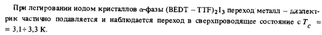 При легировании иодом кристаллов α-фазы (BEDT -TTF)2I3 переход металл диэлектрик частично подавляется и наблюдается переход в сверхпроводящее состояние с Τ -3,1-г 3,3 к. с