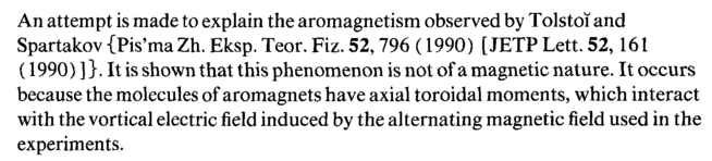 An attempt is made to explain the aromagnetism observed by Tolstoi and Spartakov {Pis'ma Zh. Eksp. Teor. Fiz. 52,796 (1990) [ JETP Lett. 52,161 (1990) ]}. It is shown that this phenomenon is not of a magnetic nature. It occurs because the molecules of aromagnets have axial toroidal moments, which interact with the vortical electric field induced by the alternating magnetic field used in the experiments.