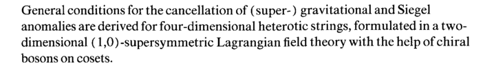 General conditions for the cancellation of (super-) gravitational and Siegel anomalies are derived for four-dimensional heterotic strings, formulated in a two-dimensional (l,0)-supersymmetric Lagrangian field theory with the help of chiral bosons on cosets.