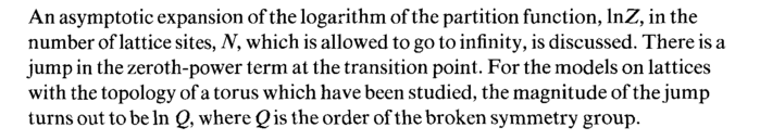 An asymptotic expansion of the logarithm of the partition function, InZ, in the number of lattice sites, N, which is allowed to go to infinity, is discussed. There is a jump in the zeroth-power term at the transition point. For the models on lattices with the topology of a torus which have been studied, the magnitude of the jump turns out to be In Q, where Q is the order of the broken symmetry group.