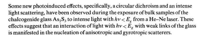 Some new photoinduced effects, specifically, a circular dichroism and an intense light scattering, have been observed during the exposure of bulk samples of the chalcogenide glass As2S3 to intense light with hv < Eg from a He-Ne laser. These effects suggest that an interaction of light with hv < Eg with weak links of the glass is manifested in the nucleation of anisotropic and gyrotropic scatterers.