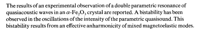 The results of an experimental observation of a double parametric resonance of quasiacoustic waves in an a~Fe203 crystal are reported. A bistability has been observed in the oscillations of the intensity of the parametric quasisound. This bistability results from an effective anharmonicity of mixed magnetoelastic modes.