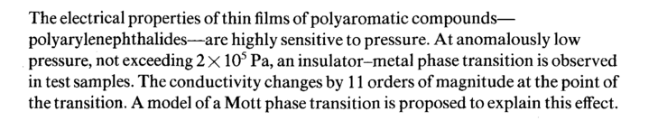 The electrical properties of thin films of polyaromatic compounds— polyarylenephthalides—are highly sensitive to pressure. At anomalously low pressure, not exceeding 2 Χ 105 Pa, an insulator-metal phase transition is observed in test samples. The conductivity changes by 11 orders of magnitude at the point of the transition. A model of a Mott phase transition is proposed to explain this effect.