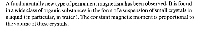 A fundamentally new type of permanent magnetism has been observed. It is found in a wide class of organic substances in the form of a suspension of small crystals in a liquid (in particular, in water). The constant magnetic moment is proportional to the volume of these crystals.