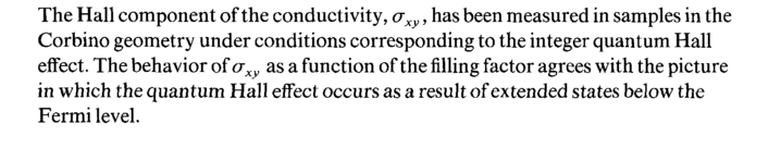 The Hall component of the conductivity, axy, has been measured in samples in the Corbino geometry under conditions corresponding to the integer quantum Hall effect. The behavior of axy as a function of the filling factor agrees with the picture in which the quantum Hall effect occurs as a result of extended states below the Fermi level.