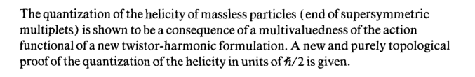 The quantization of the helicity of massless particles (end of supersymmetric multiplets) is shown to be a consequence of a multivaluedness of the action functional of a new twistor-harmonic formulation. A new and purely topological proof of the quantization of the helicity in units of fi/2 is given.
