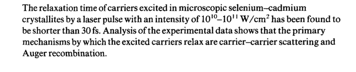 The relaxation time of carriers excited in microscopic selenium-cadmium crystallites by a laser pulse with an intensity of 10ю—1011 W/cm2 has been found to be shorter than 30 fs. Analysis of the experimental data shows that the primary mechanisms by which the excited carriers relax are carrier-carrier scattering and Auger recombination.