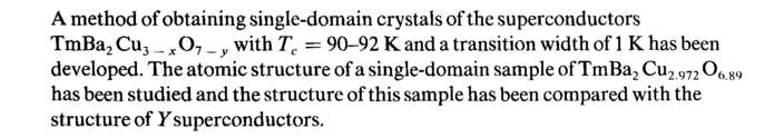 A method of obtaining single-domain crystals of the superconductors TmBa2 Cu3 „ x07 _ y with Tc — 90-92 К and a transition width of 1 К has been developed. The atomic structure of a single-domain sample of TmBa2 Cu2.972 Oe has been studied and the structure of this sample has been compared with the structure of Fsuperconductors.