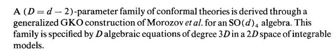 A {D = d — 2)-parameter family of conformal theories is derived through a generalized GKO construction of Morozov etal. for an SO(d)4 algebra. This family is specified by D algebraic equations of degree 3D in a 2D space of integrable models.