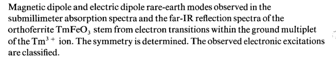Magnetic dipole and electric dipole rare-earth modes observed in the submillimeter absorption spectra and the far-IR reflection spectra of the orthoferrite TmFe03 stem from electron transitions within the ground multiplet of the Tm3 + ion. The symmetry is determined. The observed electronic excitations are classified.