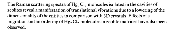 The Raman scattering spectra of Hg2 Cl2 molecules isolated in the cavities of zeolites reveal a manifestation of translational vibrations due to a lowering of the dimensionality of the entities in comparison with 3D crystals. Effects of a migration and an ordering of Hg2 Cl2 molecules in zeolite matrices have also been observed.