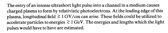The entry of an intense ultrashort light pulse into a channel in a medium causes charged plasma to form by relativistic photoelectrons. At the leading edge of this plasma, longitudinal field ^ 1 GV/cm can arise. These fields could be utilized to accelerate particles to energies δ; 1 GeV. The energies and lengths which the light pulses would have to have are estimated.
