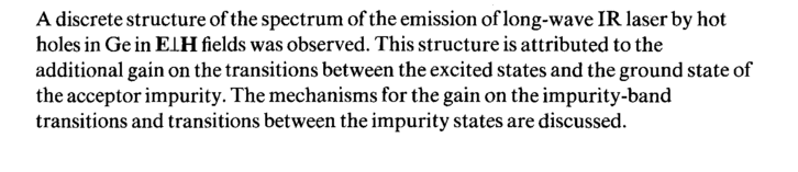 A discrete structure of the spectrum of the emission of long-wave IR laser by hot holes in Ge in E1H fields was observed. This structure is attributed to the additional gain on the transitions between the excited states and the ground state of the acceptor impurity. The mechanisms for the gain on the impurity-band transitions and transitions between the impurity states are discussed.