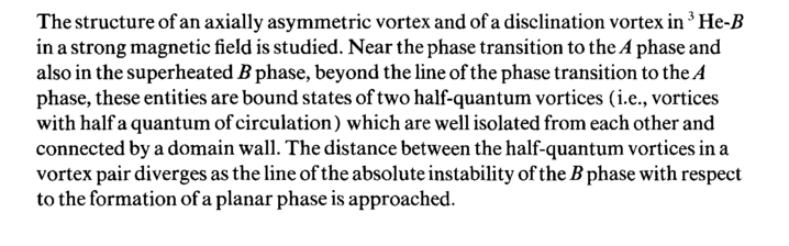 The structure of an axially asymmetric vortex and of a disclination vortex in3 He-5 in a strong magnetic field is studied. Near the phase transition to the A phase and also in the superheated В phase, beyond the line of the phase transition to the A phase, these entities are bound states of two half-quantum vortices (i.e., vortices with half a quantum of circulation) which are well isolated from each other and connected by a domain wall. The distance between the half-quantum vortices in a vortex pair diverges as the line of the absolute instability of the В phase with respect to the formation of a planar phase is approached.