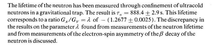 The lifetime of the neutron has been measured through confinement of ultracold neutrons in a gravitational trap. The result is r„ = 888.4 + 2.9 s. This lifetime corresponds to a ratio GA /Gv = λ of — (1.2677 + 0.0025). The discrepancy in the results on the parameter Я found from measurements of the neutron lifetime and from measurements of the electron-spin asymmetry of the/? decay of the neutron is discussed.