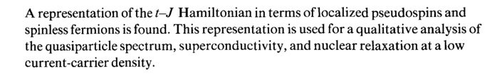 A representation of the t-J Hamiltonian in terms of localized pseudospins and spinless fermions is found. This representation is used for a qualitative analysis of the quasiparticle spectrum, superconductivity, and nuclear relaxation at a low current-carrier density.