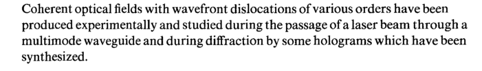 Coherent optical fields with wavefront dislocations of various orders have been produced experimentally and studied during the passage of a laser beam through a multimode waveguide and during diffraction by some holograms which have been synthesized.