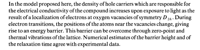 In the model proposed here, the density of hole carriers which are responsible for the electrical conductivity of the compound increases upon exposure to light as the result of a localization of electrons at oxygen vacancies of symmetry D 2h. During electron transitions, the positions of the atoms near the vacancies change, giving rise to an energy barrier. This barrier can be overcome through zero-point and thermal vibrations of the lattice. Numerical estimates of the barrier height and of the relaxation time agree with experimental data.