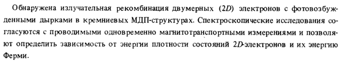 Обнаружена излучательная рекомбинация двумерных (2D) электронов с фотовозбужденными дырками в кремниевых МДП-структурах. Спектроскопические исследования согласуются с проводимыми одновременно магнитотранспортными измерениями и позволяют определить зависимость от энергии плотности состояний 2Z>электронов и их энергию Ферми.