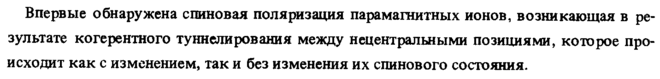 Впервые обнаружена спиновая поляризация парамагнитных ионов, возникающая в результате когерентного туннели ров ани я между нецентральными позициями, которое происходит как с изменением, так и без изменения их спинового состояния.