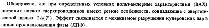 Обнаружено, что при определенных условиях вольт-амперные характеристики (ΒΑΧ) широких пленок сверхпроводников имеют резкие особенности, совпадающие с энергетической щелью 2Δ(Γ). Эффект связывается с механизмом разрушения куперовских пар в линии проскальзывания фазы (ЛПФ).