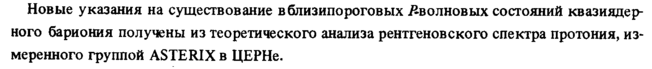 Новые указания на существование вблизипороговых ^волновых состояний квазиядерного бариония получены из теоретического анализа рентгеновского спектра протония, измеренного группой ASTERIX в ЦЕРНе.