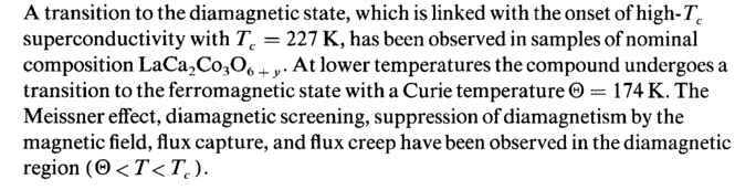 A transition to the diamagnetic state, which is linked with the onset of highTc superconductivity with Tc = 227 K, has been observed in samples of nominal composition LaCa2Co306 + y. At lower temperatures the compound undergoes a transition to the ferromagnetic state with a Curie temperature Θ — 174 К. The Meissner effect, diamagnetic screening, suppression of diamagnetism by the magnetic field, flux capture, and flux creep have been observed in the diamagnetic region (Θ< T< Tc.).