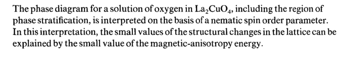 The phase diagram for a solution of oxygen in La2Cu04, including the region of phase stratification, is interpreted on the basis of a nematic spin order parameter. In this interpretation, the small values of the structural changes in the lattice can be explained by the small value of the magnetic-anisotropy energy.
