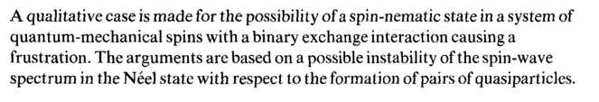 A qualitative case is made for the possibility of a spin-nematic state in a system of quantum-mechanical spins with a binary exchange interaction causing a frustration. The arguments are based on a possible instability of the spin-wave spectrum in the Neel state with respect to the formation of pairs of quasiparticles.