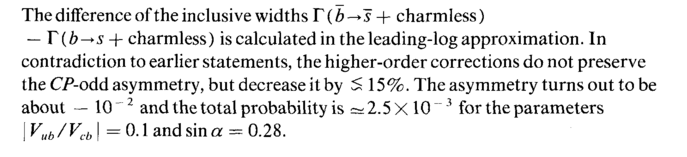 The difference of the inclusive widths Γ (b—s + charmless) — T{b^s + charmless) is calculated in the leading-log approximation. In contradiction to earlier statements, the higher-order corrections do not preserve the CP-odd asymmetry, but decrease it by 515%. The asymmetry turns out to be about — 10"2 and the total probability is ~2.5X10~3 for the parameters I Vub/Vcb I = 0.1 and sin a 0.28.