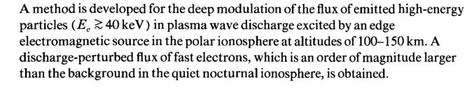 A method is developed for the deep modulation of the flux of emitted high-energy particles (Ee £ 40 keV) in plasma wave discharge excited by an edge electromagnetic source in the polar ionosphere at altitudes of 100-150 km. A discharge-perturbed flux of fast electrons, which is an order of magnitude larger than the background in the quiet nocturnal ionosphere, is obtained.