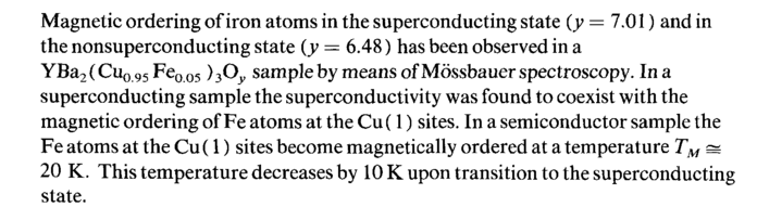 Magnetic ordering of iron atoms in the superconducting state (y = 7.01) and in the nonsuperconducting state (y = 6.48) has been observed in a YBa2(Cu0 95 Fe005 )3Oy sample by means of Mossbauer spectroscopy. In a superconducting sample the superconductivity was found to coexist with the magnetic ordering of Fe atoms at the Cu (1) sites. In a semiconductor sample the Fe atoms at the Cu (1) sites become magnetically ordered at a temperature TM =s 20 K. This temperature decreases by 10 К upon transition to the superconducting state.