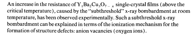 An increase in the resistance of Y!Ba2Cu307_ x single-crystal films (above the critical temperature), caused by the "subthreshold" x-ray bombardment at room temperature, has been observed experimentally. Such a subthreshold x-ray bombardment can be explained in terms of the ionization mechanism for the formation of structure defects: anion vacancies (oxygen ions).