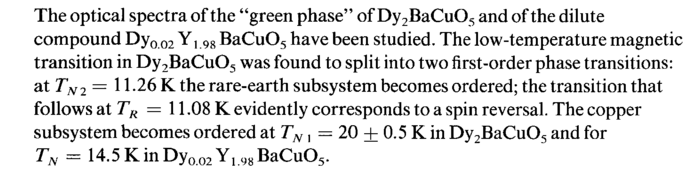 The optical spectra of the "green phase" of Dy2BaCu05 and of the dilute compound Dy0 02 Yj 98 BaCu05 have been studied. The low-temperature magnetic transition in Dy2BaCu05 was found to split into two first-order phase transitions: at TN2 = Π-26 К the rare-earth subsystem becomes ordered; the transition that follows at TR =11.08 К evidently corresponds to a spin reversal. The copper subsystem becomes ordered at TN] = 20 + 0.5 К in Dy2BaCu05 and for TN = 14.5KinDy0.o2Yi.98BaCu05.