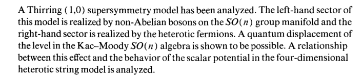 A Thirring (1,0) supersymmetry model has been analyzed. The left-hand sector of this model is realized by non-Abelian bosons on the SO (η) group manifold and the right-hand sector is realized by the heterotic fermions. A quantum displacement of the level in the Kac-Moody SO (η) algebra is shown to be possible. A relationship between this effect and the behavior of the scalar potential in the four-dimensional heterotic string model is analyzed.
