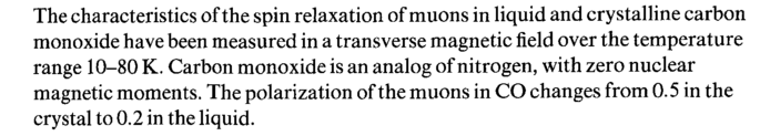 The characteristics of the spin relaxation of muons in liquid and crystalline carbon monoxide have been measured in a transverse magnetic field over the temperature range 10-80 K. Carbon monoxide is an analog of nitrogen, with zero nuclear magnetic moments. The polarization of the muons in CO changes from 0.5 in the crystal to 0.2 in the liquid.